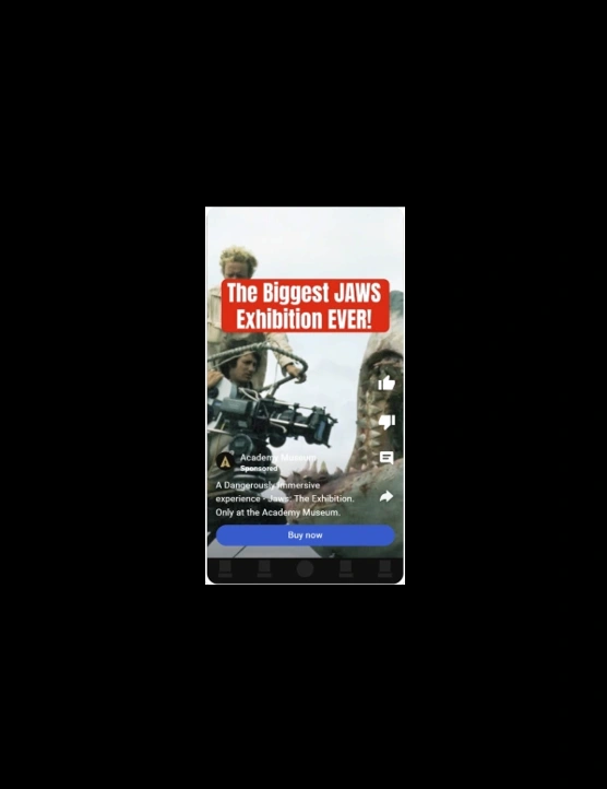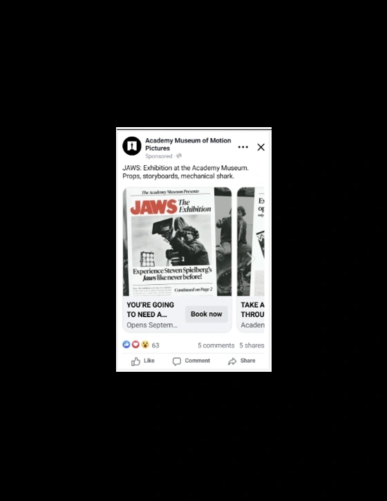 In 2025, the Academy Museum opened its largest-ever exhibition dedicated to a single film: Jaws. It explores the film’s production as well as its far-reaching impact 50 years after it premiered. It includes original objects, behind-the-scenes revelations, and interactive moments. The museum, opened in 2021, wanted to make a big splash for this first of its kind exhibit. They partnered with creative agency Tronvig and DCW Media to create a paid social media campaign to: